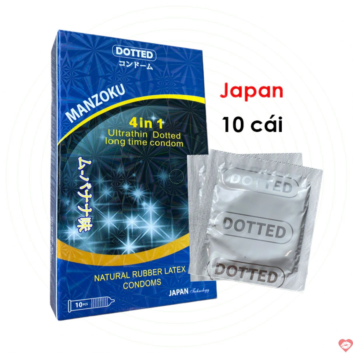 - Đặc điểm: Bao cao su Manzoku 0.02 4 in 1 là một trong những sản phẩm bao cao su siêu mỏng, có tác dụng kéo dài thời gian quan hệ tốt nhất hiện nay. BCS Manzoku Ultrathin Dotted long time condom được sản xuất và đóng gói trên dây truyền hiện đại của Nhật Bản với nguồn nguyên liệu cao cấp đáp ứng đầy đủ các tiêu chuẩn khắt khe nhất. Bao cao su Manzoku 4 trong 1 chính hãng Nhật Bản với nhiều ưu điểm như: siêu mỏng, siêu bền và siêu chuyền nhiệt mang lại cảm giác tự nhiên như thật khi quan hệ. Ngoài ra, bcs Manzoku 0.02 được bổ sung thêm hợp chất gây tê lidocaine với hàm lượng 5% giúp nam giới chống xuất tinh sớm vô cùng hiệu quả.