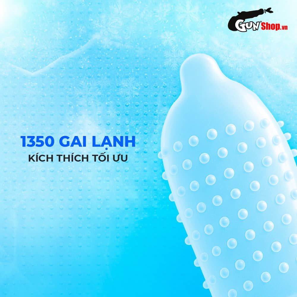 Đặc điểm: Hệ thống 1350 gai lạnh kích thích đa điểm. Tinh chất bạc hà tạo hiệu ứng mát lạnh, kéo dài khoái cảm. Siêu mỏng 0.04mm cho cảm giác chân thật tự nhiên. Chất liệu cao su thiên nhiên tinh lọc, không mùi, an toàn cho da. Lớp bôi trơn mát lạnh gốc nước, dễ chịu và dễ vệ sinh.