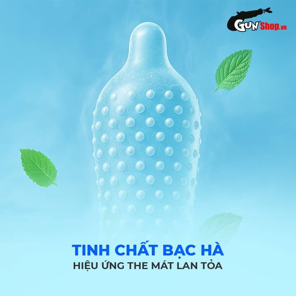 Bên trong mỗi chiếc bao là hệ thống 1350 gai lạnh kết hợp tinh chất bạc hà, tạo hiệu ứng mát lạnh lan tỏa ngay khi tiếp xúc. Cảm giác mát lạnh nhẹ nhàng giúp tăng hưng phấn, kéo dài khoái cảm, đem lại sự mới mẻ cho những cuộc yêu vốn đã quen thuộc.