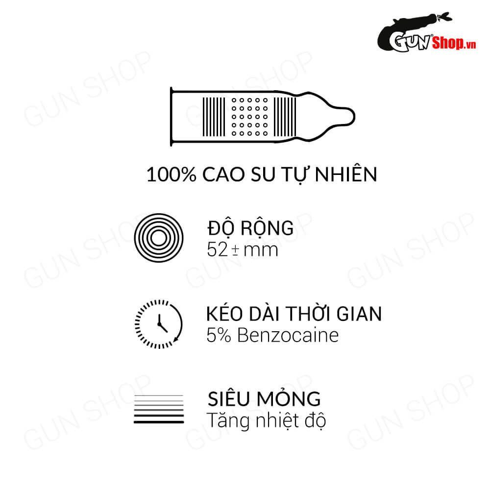 Bên cạnh thiết kế siêu mỏng, sản phẩm còn có khả năng kéo dài thời gian hiệu quả, hay thiết kế gân gai ấn tượng. Từ đó đem đến cho chàng và nàng một đêm tình say đắm, sung sướng, quyến luyến không nỡ tách rời.