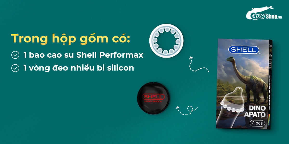 - Thông tin: Shell Dino Apato là một thành viên trong bộ sưu tập bao cao su Dino gân gai bi đem lại siêu khoái cảm. Với Dino Apato, bạn sẽ được trải nghiệm cảm giác kích thích đem lại từ 12 bi silicon siêu lớn nhưng trơn nhẵn và mềm mại không gây đau rát. Các bi này có tác dụng trong việc tăng kích thước, kéo dài thời gian quan hệ và đặc biệt là kích thích khoái cảm cho bạn nữ. Bên cạnh đó, sản phẩm còn bao gồm 1 bao cao su Shell Performax 6 tính năng: Kéo dài thời gian, gân, điểm nổi, nút thắt chống tuột, siêu mỏng, hương dâu hứa hẹn đem lại cho bạn những cảm giác thăng hoa tuyệt vời khi quan hệ.