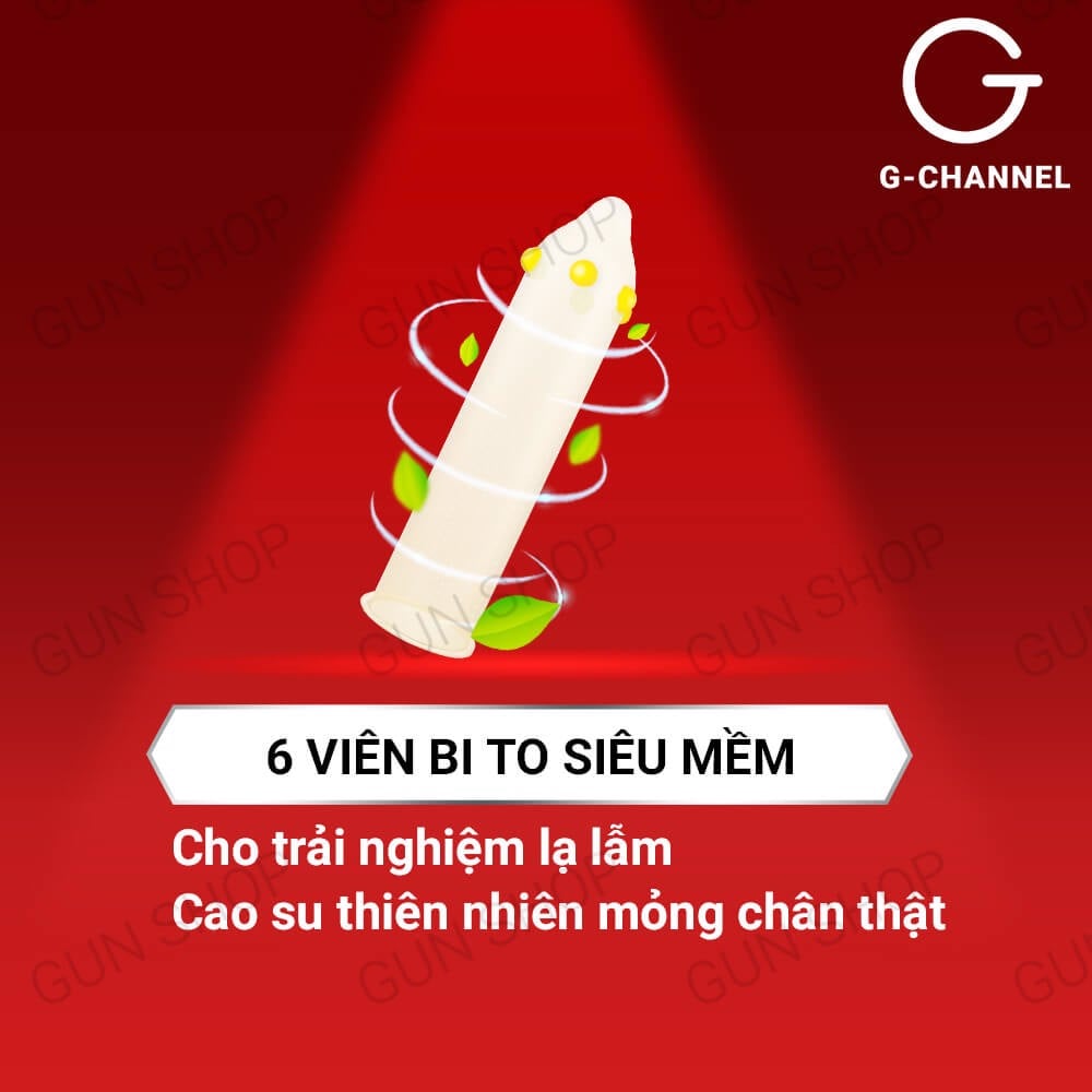 Sản phẩm được làm từ cao su thiên nhiên với thiết kế độc đáo gồm 6 viên bi to siêu mềm được dính chặt ở đầu bao. Khiến nàng rên lên vì sung sướng bởi trải nghiệm lạ lẫm nhưng vẫn giữ được hơi ấm từ cơ thể bạn tình vì sản phẩm vẫn đảm bảo độ mỏng chân thật và truyền nhiệt tốt.
