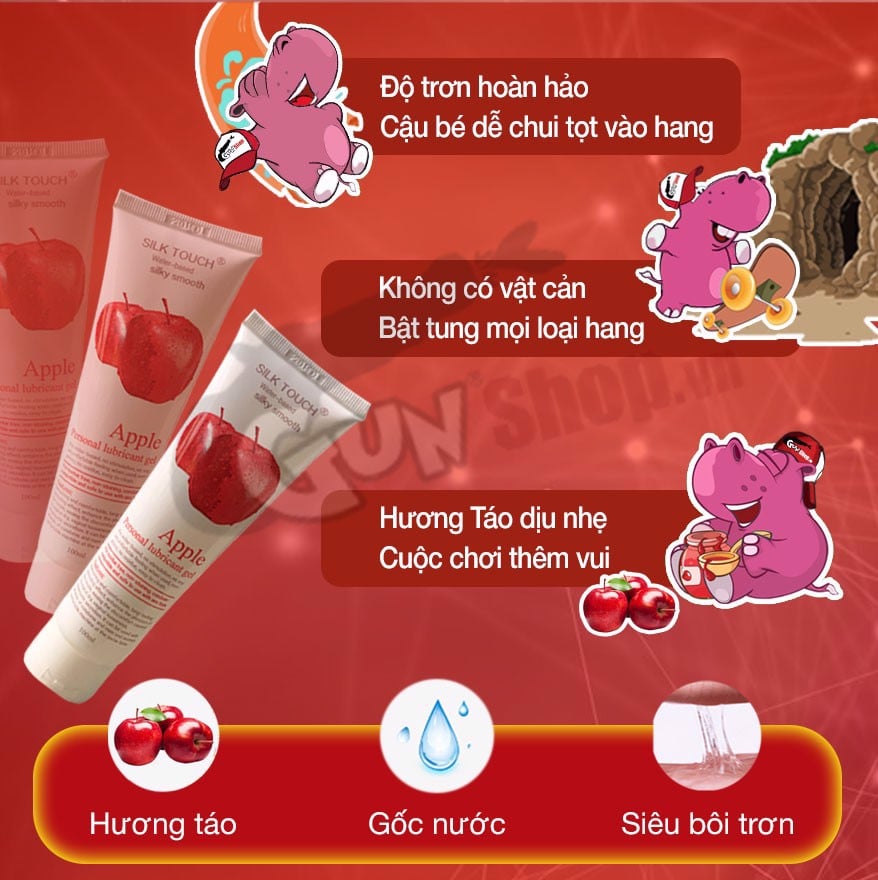 Gel bôi trơn có mùi hương táo - Silk Touch là một sản phẩm gel bôi trơn gốc nước vô cùng an toàn cho mọi người sử dụng. Sản phẩm có sự kết hợp của hương táo dịu nhẹ, thành phần an toàn giúp cho bạn có thể thỏa sức "xõa" theo mọi tư thế “yêu” của mình.