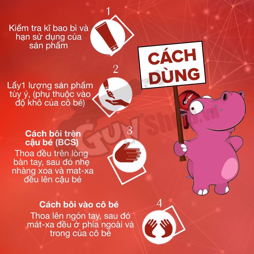 Bôi gel bôi trơn và âm đạo, hậu môn (đối với các cặp đôi quan hệ cửa sau) và một chút vào dương vật.