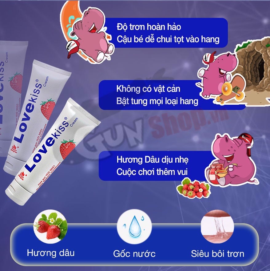 Gel bôi trơn Love Kiss hương dâu được sản xuất theo dây chuyền công nghệ hiện đại. Sản phẩm dạng gel gốc nước bôi trơn rất giống với chất nhờn tự nhiên được tiết ra khi quan hệ, tạo sự dễ chịu khi sử dụng. Công dụng của gel hữu hiệu trong việc cấp thêm chất nhờn, đủ độ ẩm cho “cô bé” khi quan hệ dễ dàng, không đau rát.