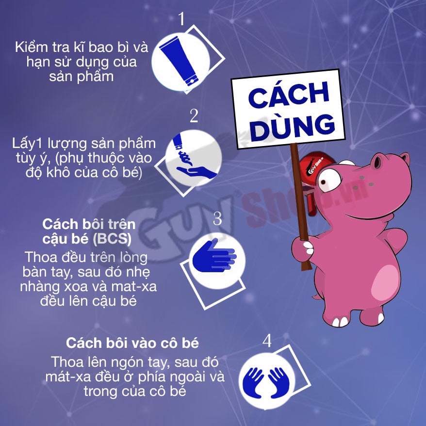 Bôi trên “cậu bé”: Lấy ít gel cho vào lòng bàn tay xoa nhẹ rồi thoa đều lên “cậu bé”, có massage nhẹ nhàng.