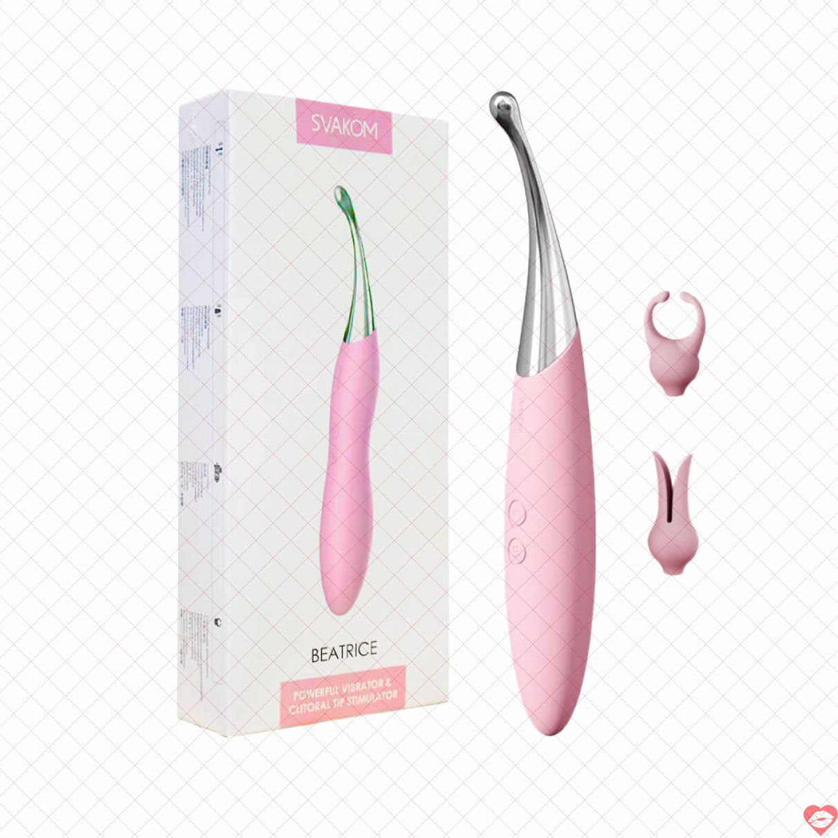 • Thông tin: Svakom Beatrice có thiết kế đặc biệt với 2 đầu rung gồm 1 đầu nhỏ như đầu bút chì hơi cong lại và 1 đầu to thon dài giúp chị em có thể thay đổi được nhiều kiểu kích thích khác nhau mỗi khi thủ dâm. Đồng thời Svakom Beatrice còn sở hữu 5 chế độ và 5 cường độ rung khác nhau xoay chuyển 2 đầu giúp kích thích vào âm vật hoặc âm đạo một cách mạnh mẽ khiến chị em dễ dàng lên đỉnh cực khoái cao trào.