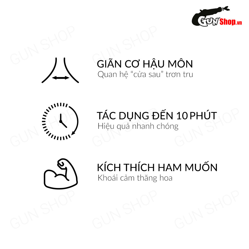 Đặc điểm: Kích thích ham muốn tình dục mãnh liệt, khiến cho cơ thắt hậu môn cũng co giãn dễ dàng hơn, “mở đường” cho công cuộc quan hệ “cửa sau” tràn ngập khoái cảm thăng hoa của đôi trẻ. Mùi hương của sản phẩm không hắc, không gây nên cảm giác đau đầu khi sử dụng.