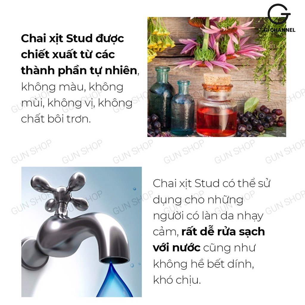 - Chai xịt Stud được chiết xuất từ các thành phần tự nhiên, không màu, không mùi, không vị. Nó được đánh giá có hiệu quả cực tốt cho sức khỏe của nam giới. An toàn và không gây nên bất cứ tác dụng phụ nào.