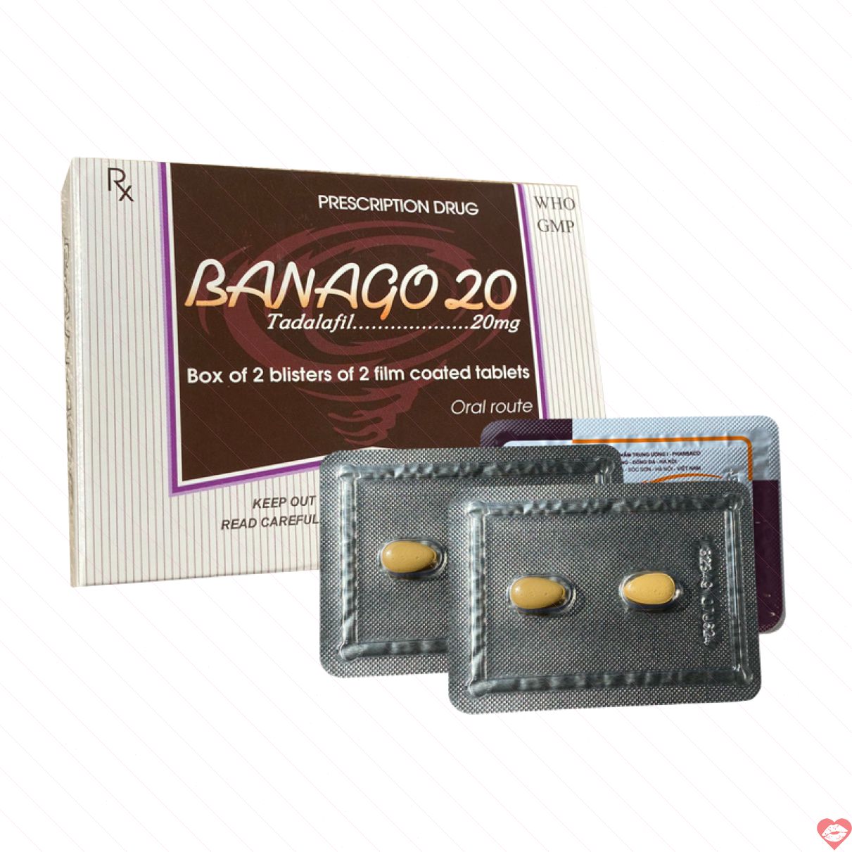 - Đặc điểm: Thuốc Banago 20 có thành phần chính là hoạt chất Tadalafil được sử dụng để điều trị rối loạn cương dương, xuất tinh sớm, mất ham muốn. Đây là một trong những loại thuốc kéo dài thời quan hệ khá tốt, được nhiều nam giới lựa chọn sử dụng.