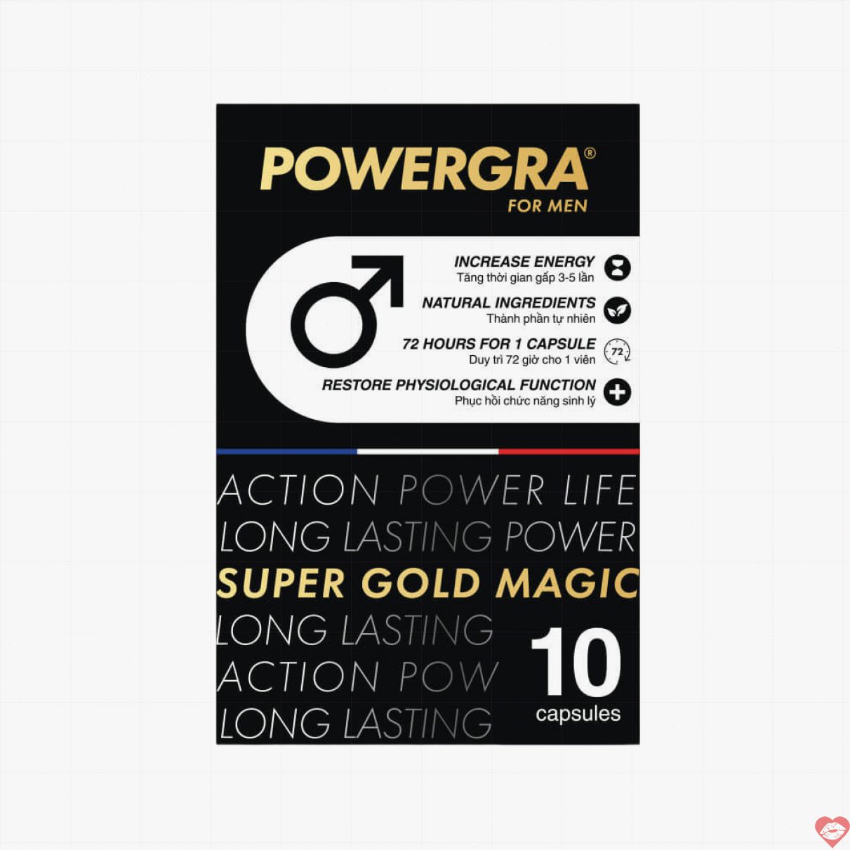 - Đặc điểm: Tăng thời gian quan hệ 3 - 5 lần, tăng kích thước dương vật, hỗ trợ cương cứng, duy trì hiệu quả 72 giờ, không gây tác dụng phụ và mệt mỏi sau khi sử dụng.
